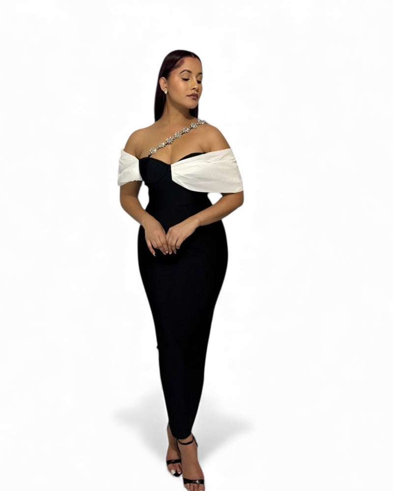 Black & Ivory Crystal Strap Off the Shoulder Gown