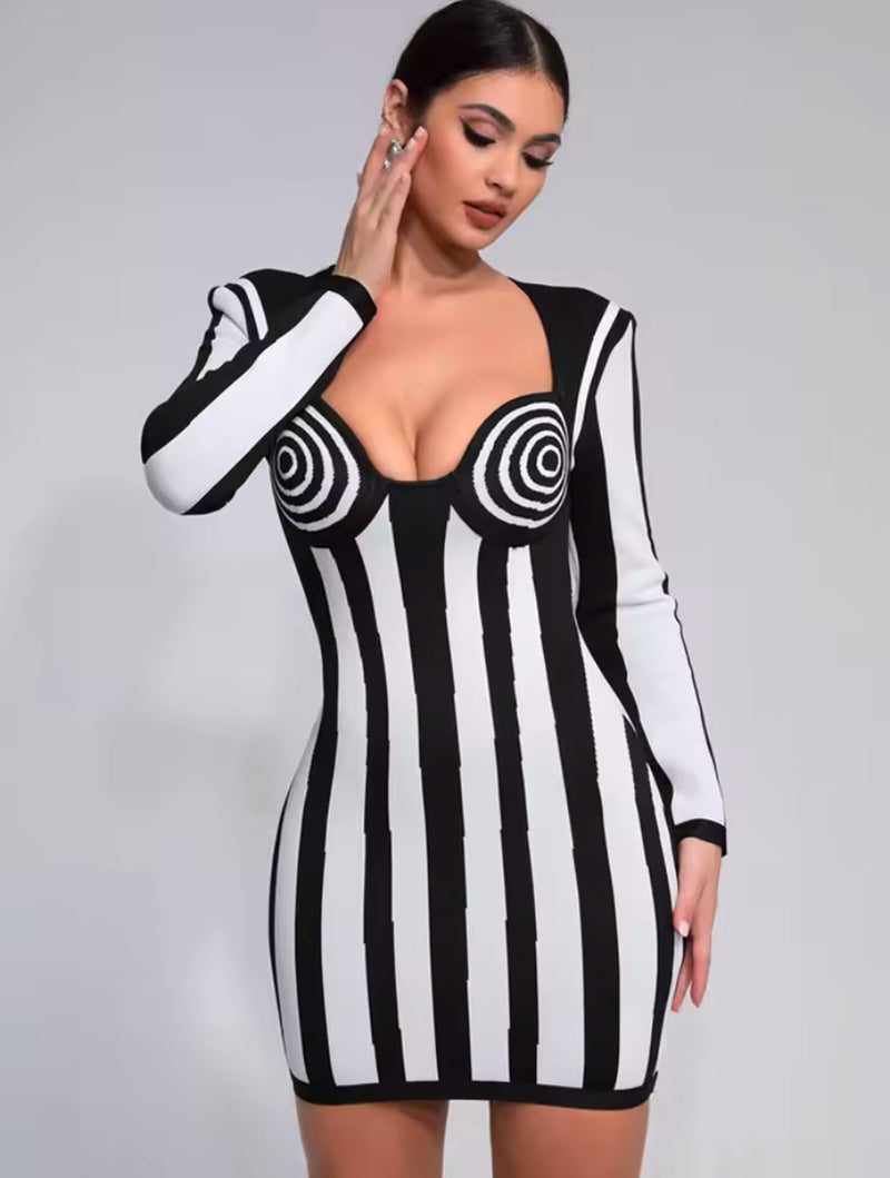 Been Official Black & White Striped Bandage Dress