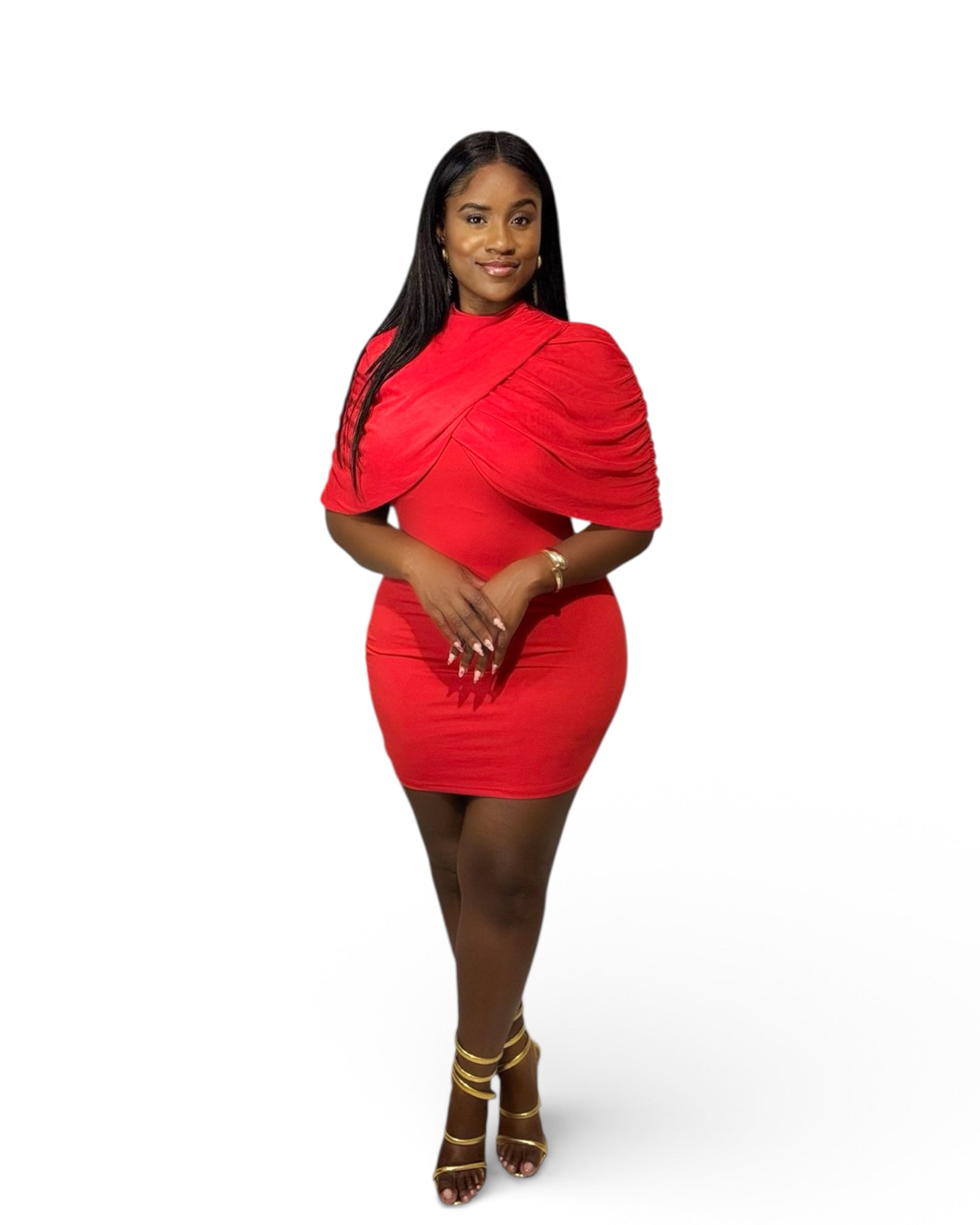 The First Lady Red Draped Bodycon Dress features a form-fitting bodycon silhouette complemented by a draped, ruched cape-style top. This design not only enhances the body's natural curves but also provides a sophisticated aesthetic, making it suitable for formal occasions. The vibrant red color adds a striking element to the overall look.