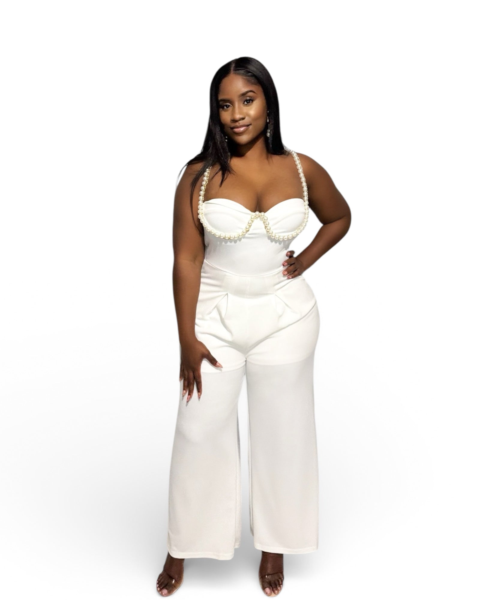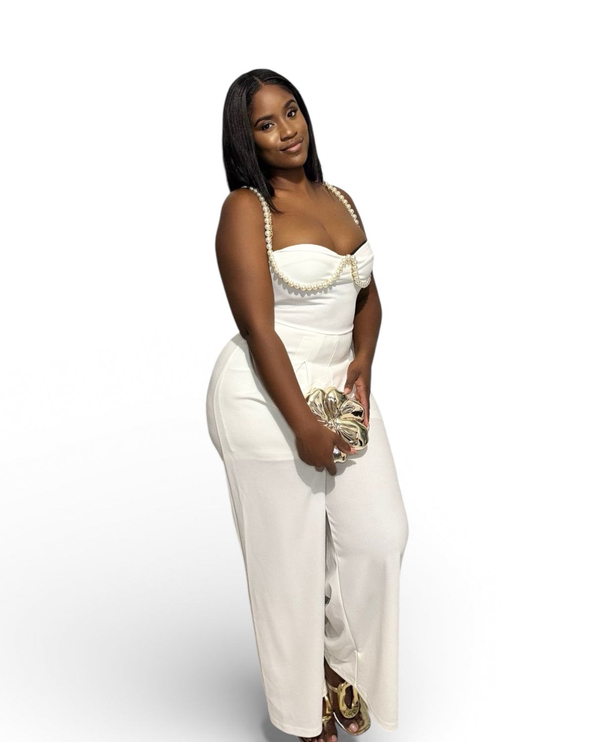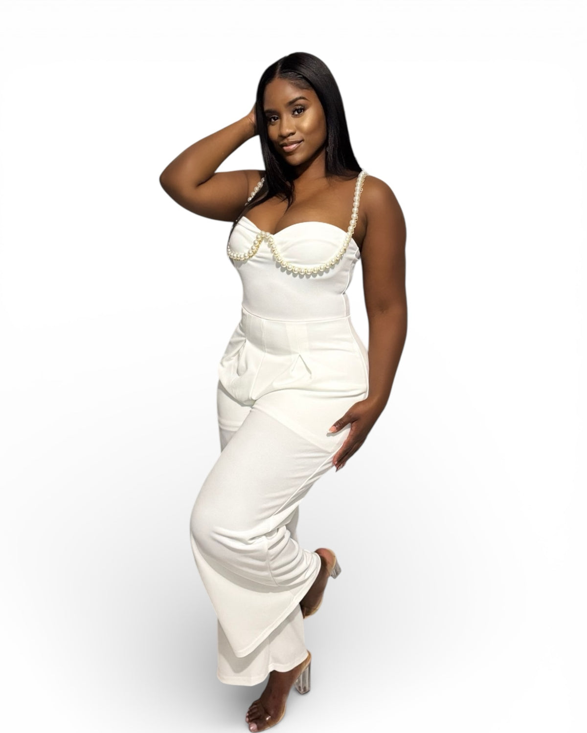 The Lady Pearl Jumpsuit features an elegant pearl design set against a classic white fabric. This sophisticated garment seamlessly blends style and versatility, making it suitable for formal events or casual outings. Its timeless aesthetic allows for easy integration into various wardrobes, enhancing overall attire effortlessly.