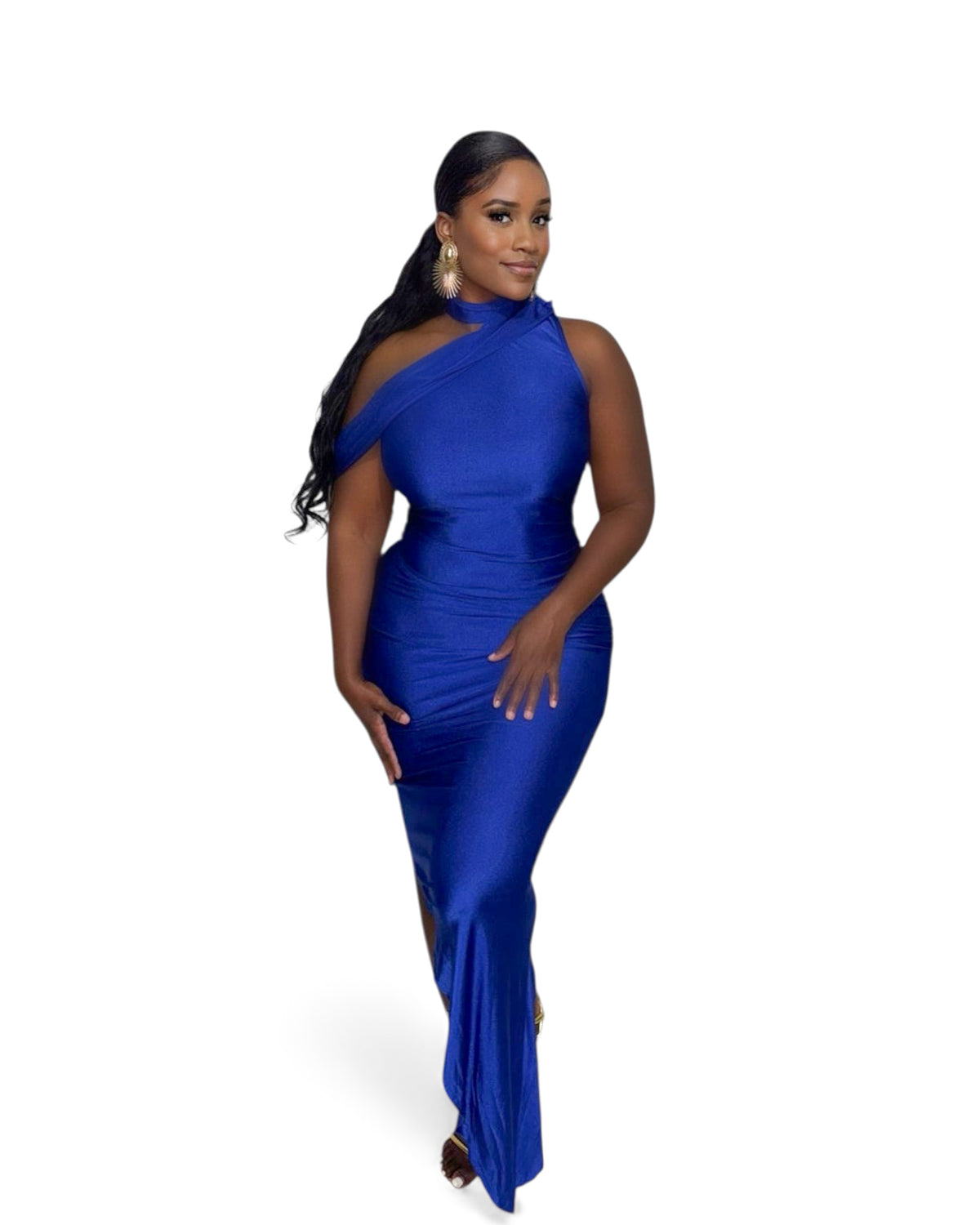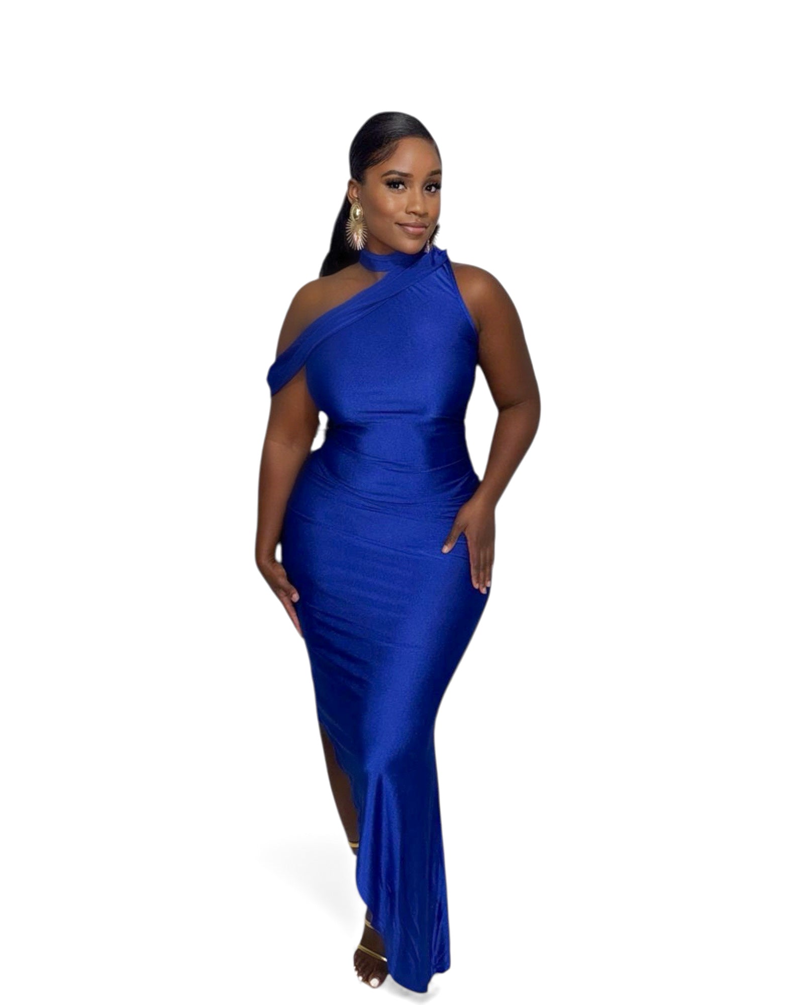 Elevate your style with our Blue Royale Elegance Dress. The asymmetrical design features a royal blue drape that flows gracefully to the floor on one side and is knee-length on the other. Made from a blend of polyester and elastine for comfort and elegance. Perfect for any formal occasion.