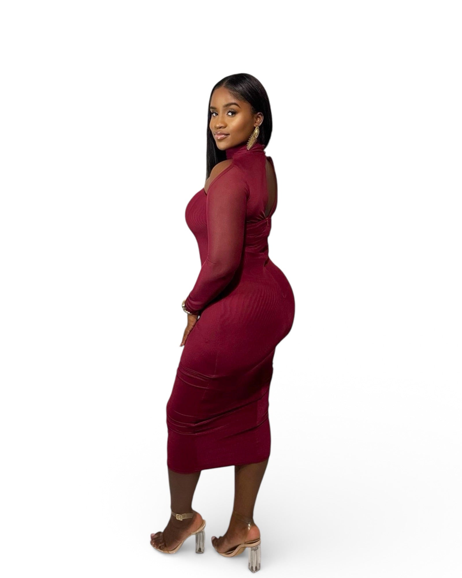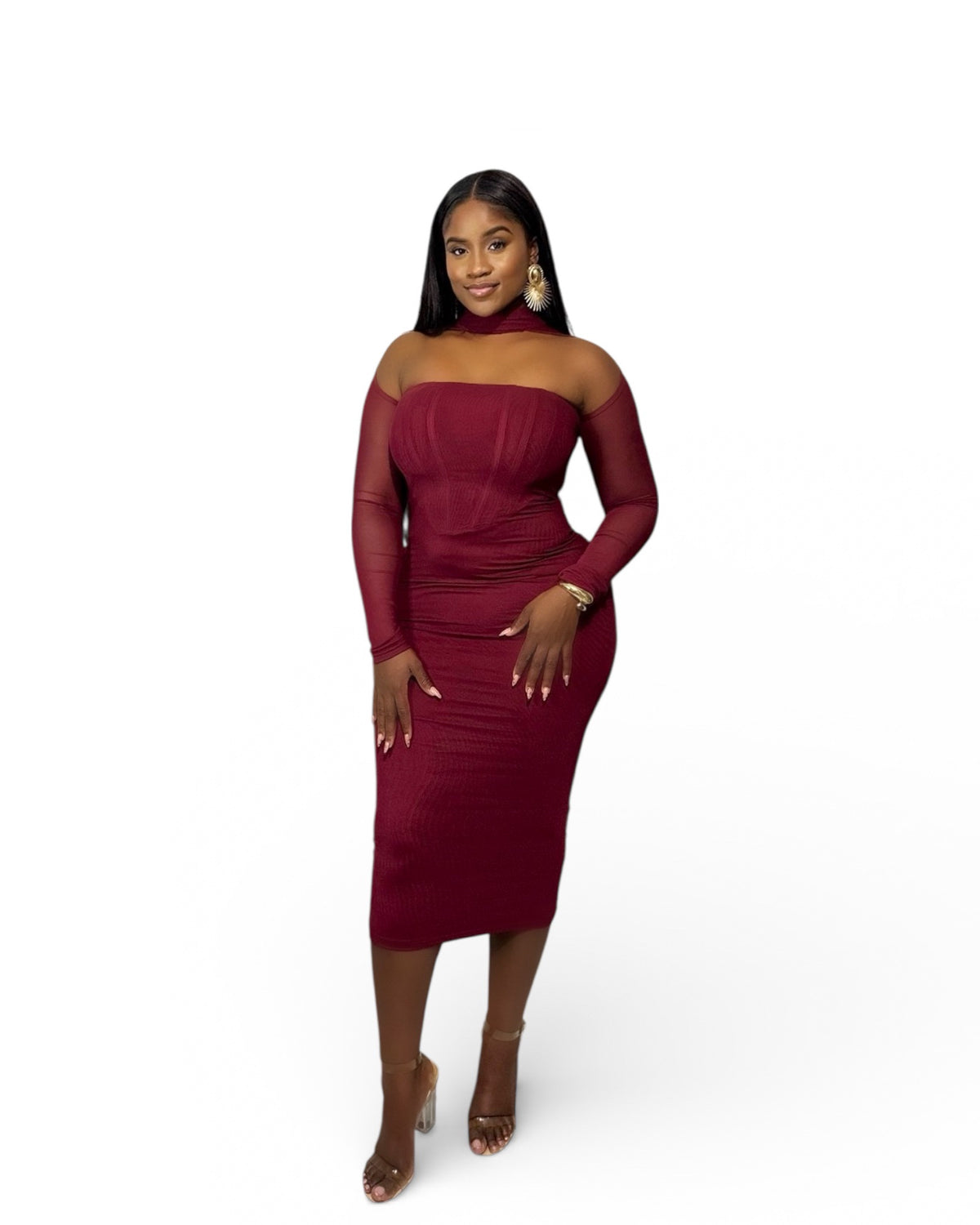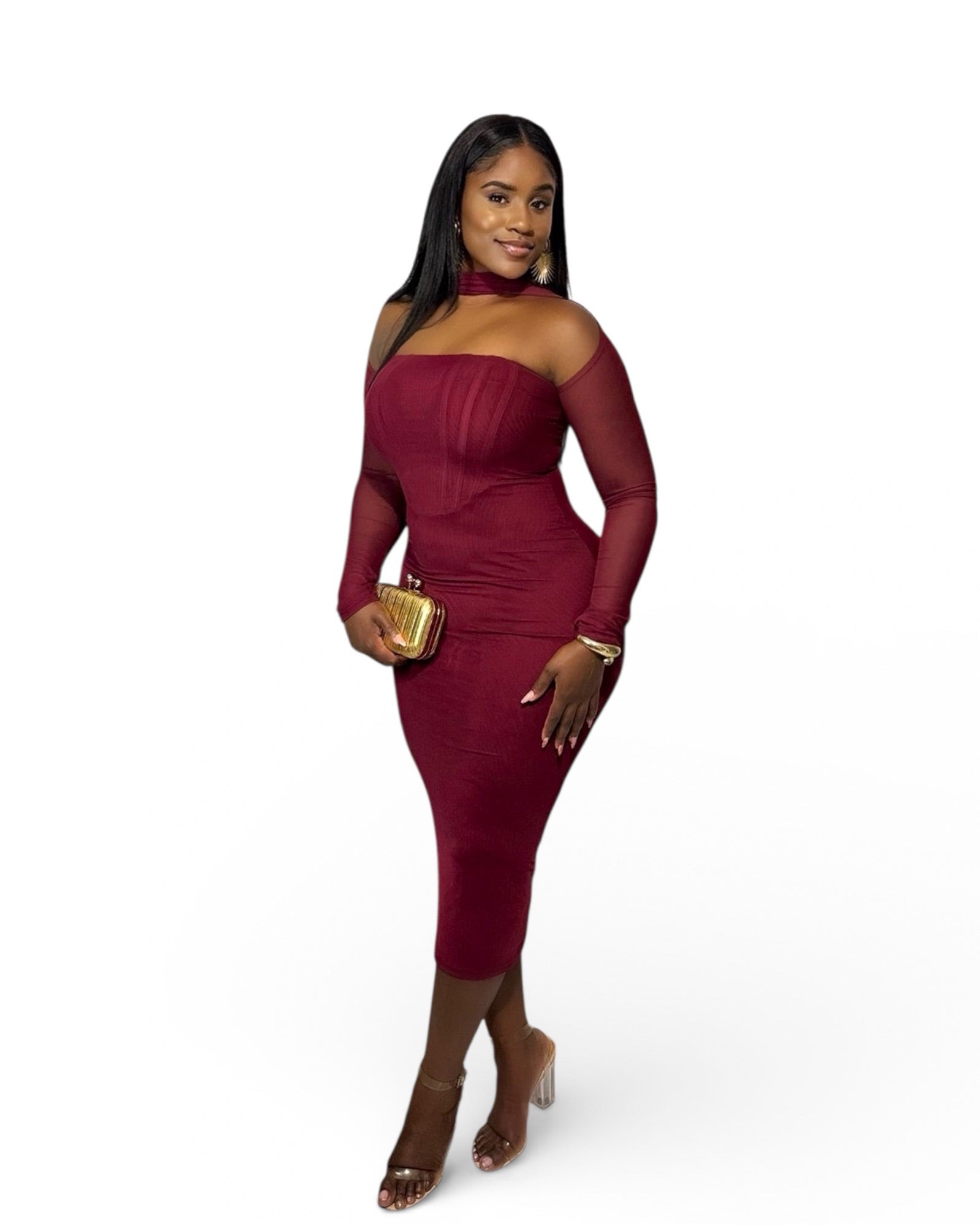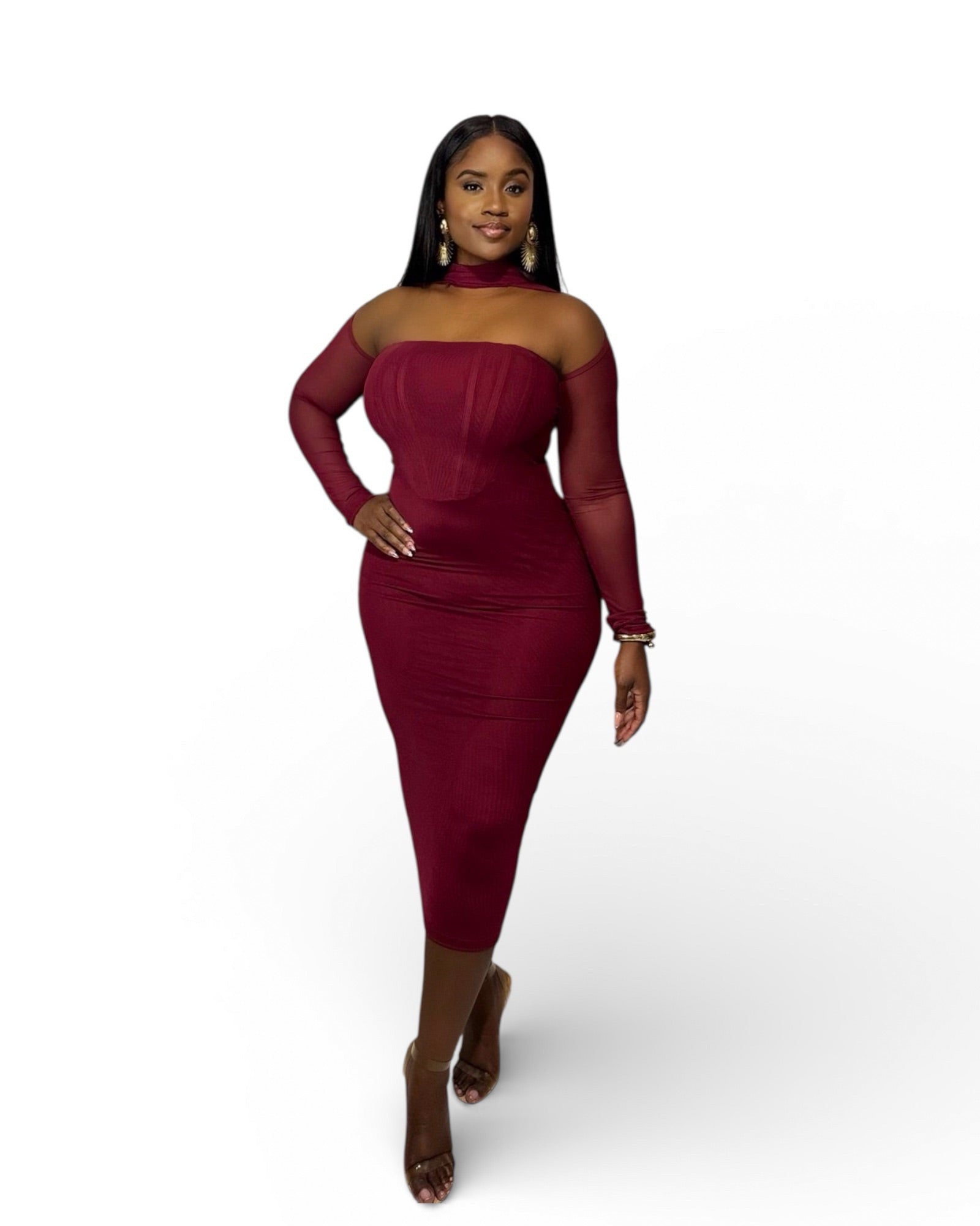 The Private Affair Long Sleeve Midi is designed in both burgundy and black, offering a sophisticated and classy appearance suitable for various formal occasions. The midi length ensures versatility and comfort, while the long sleeves provide additional coverage. This garment is ideal for those seeking an elegant and refined style.